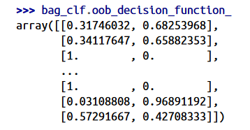 bag_clf = BaggingClassifier( DecisionTreeClassifier(), n_estimators=500, oob_score = True, bootstrap=True, n_jobs-1) bag_clf.fit(X_train, y_train) bag_clf.oob_score_ # 0.90133333333333332