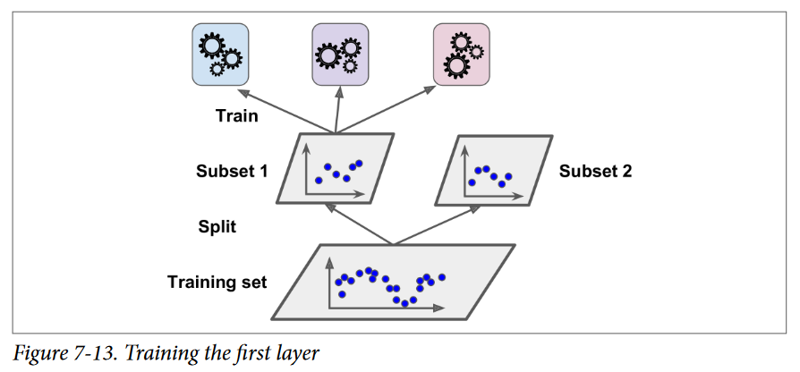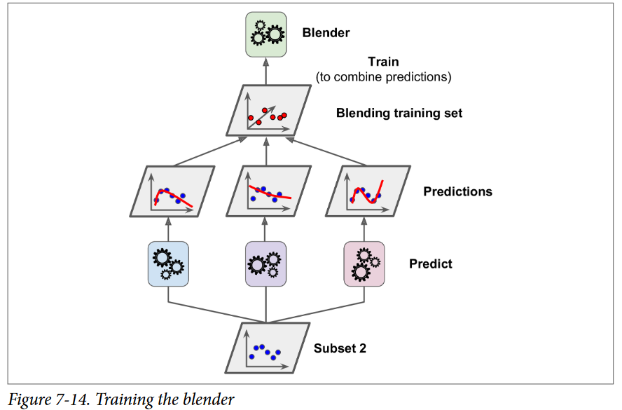 با این روش میتونیم چندین Blender متفاوت رو آموزش بدیم تا یک لایهی کامل از Blenderها داشته باشیم. (مثلا یکی با استفاده از Linear Regression و یکی با استفاده از Radnom Forest Regression) نکته اینجاست که ترینینگ ست رو به سه زیرمجموعه تقسیم کنیم: از اولین زیرمجموعه استفاده میشه تا لایهی اول آموزش ببینه، از دومی استفاده میشه تا یک ترینینگ ست برای آموزش لایهی دوم درست بشه (با استفاده از پیشبینیهایی که توسط Predictorهای لایهی اول انجام شده) و از سومی استفاده میشه تا یک ترینینگ ست برای آموزش لایهی سوم درست بشه ( با استفاده از پیشبینیهایی که توسط Predictorهای لایهی دوم انجام شده) وقتی این کار تموم بشه، میتونیم با رفتن به هر لایه بهصورت ترتیبی، یک پیشبینی برای یک نمونهی جدید انجام بدیم. در شکل پایین نشون داده شده.