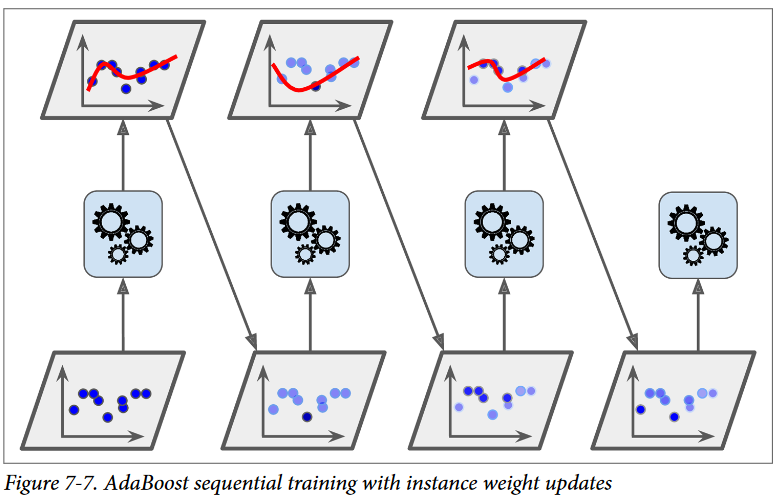 برای مثال وقتی داریم یک AdaBoost Classifier آموزش میدیم، الگوریتم در ابتدا یک Base Classifier آموزش میده (مثلا یک درخت تصمیم) و از اون استفاده میکنه تا پیشبینیهایی روی مجموعهی آموزشی انجام بده. بعد الگوریتم وزن نسبی نمونههای آموزشیای که به اشتباه طبقهبندی شدن، افزایش میده. بعد یک Classifier دوم رو با استفاده از وزنهای بهروزرسانی شده آموزش میده و دوباره روی ترینینگ ست پیشبینی انجام میده، وزن نمونههارو بهروزرسانی میکنه و الی آخر.