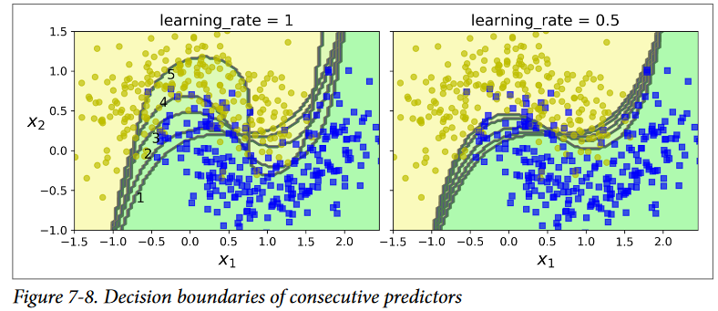 شکل سمت راست همین ترتیب از Predictorها رو نشون میده با این تفاوت که Learning Rate نصف شده (یا به عبارتی دیگه در هر تکرار، وزن نمونههای بهاشتباه طبقهبندی شده یک دوم افزایش پیدا میکنه) همونطور که میبینید این تکنیک ِ یادگیری ِ ترتیبی، یک سری شباهتها به Gradient Descent داره، بهجز اینکه بهجای اینکه پارامترهای یک Predictor رو دستکاری کنیم تا تابع هزینه کاهش پیدا کنه، AdaBoost یک سری Predictorها رو به Ensemble اضافه میکنه تا بهتدریج نتیجه رو بهتر کنه.