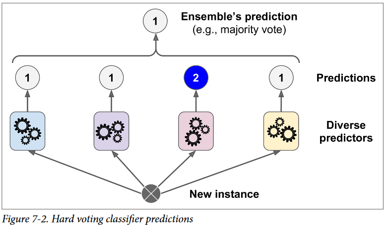 یک راه ساده برای درست کردن یک Classifier بهتر، ترکیب پیشبینی هر Classifier هست بهطوری که هر پیشبینیای که بیشترین رای رو داشت، بهعنوان پیشبینی نهایی انتخاب بشه. این Majority-Vote Classifier (طبقهبندی کنندهای که تخمین رو با رای اکثریت انجام میده) Hard Voting Classifier نام داره.