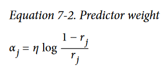 حالا با استفاده از فرمول زیر وزن Predictor محاسبه میشه که اون رو با آلفای جِی نشون میدیم. علامت اِتا در اینجا هایپرپارامتر Learning Rate هست (دیفالت برابر 1) هرچقدر Predictor دقیقتر باشه، وزنش هم بیشتر میشه. اگر بهصورت رندوم پیشبینیهارو انجام بده، وزن اون نزدیک به صفر میشه. اگر در اکثر مواقع اشتباه کنه (یعنی دقتش حتی از حدس زدن رندوم هم کمتر باشه) مقدارش منفی میشه.