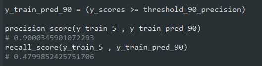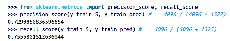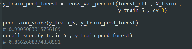اگر بخوایم Precision و Recall رو هم حساب کنیم، اول باید تابع cross_val_predict رو فراخوانی کنیم تا حدس بزنه و بعد میتونیم اون ها رو محاسبه کنیم:
