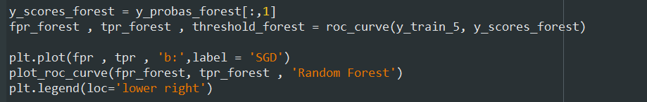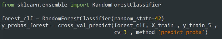 حالا بیاید یک RandomForestClassifier ترین کنیم و عملکردش رو با SGDClassifier مقایسه کنیم. اول باید امتیاز هر نمونه در ترینینگ ست رو بهدست بیاریم. اما بخاطر متفاوت بودن عملکرد این الگوریتم، تابع decision_function نداره و به جاش باید از predict_proba استفاده کنیم. خروجی این تابع یک آرایه شامل یک ردیف برای هر نمونه و یک ستون برای هر دسته هست و هر کدوم شامل احتمال قرار گرفتن یک نمونه در هر دسته رو نشون میدن.