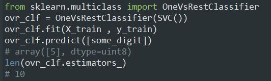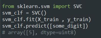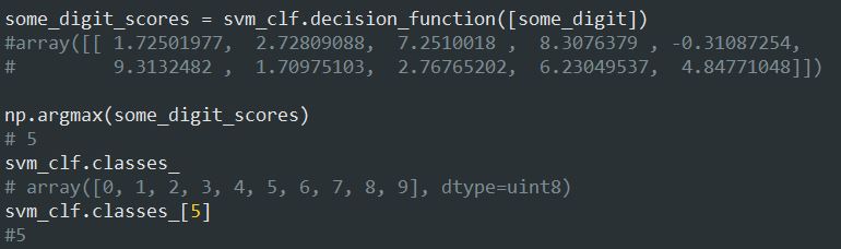 این کد SVC رو با استفاده از دسته هایی که توی y_train هست یعنی اعداد 0 تا 9، روی ترینینگ ست ترین میکنه. بعدش یک حدس درست میزنه. در واقع اتفاقی که پشت این کد میفته این هست که Scikit-Learn از استراتژی OvO استفاده میکنه: 45 تا Binary Classifier ترین میکنه و امتیاز تصمیم گیری هر کدوم رو برای عکس بدست میاره و دسته ای رو انتخاب میکنه که بیشترین امتیاز رو داره.