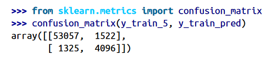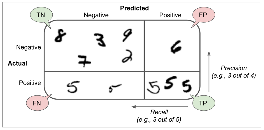 هر ردیف این ماتریس نشون دهندهی یک دسته هست و هر ستون نشون دهندهی دسته حدس زده شده ست.(این اعداد ممکنه برای شما فرق داشته باشن) اولین ردیف این ماتریس نشون دهندهی عکس های غیر 5 هست (دسته منفی): 53057 عدد به درستی بعنوان غیر 5 دسته بندی شدند (منفی های درست) در حالیکه 1522 تا به اشتباه بعنوان 5 دسته بندی شدند (مثبت های غلط). دومین ردیف نشون دهندهی عکس های 5 هست (دسته مثبت): 1325 تا به اشتباه غیر 5 دسته بندی شدند (منفی های غلط) و 4096 تا به درستی 5 دسته بندی شدند (مثبت های درست)