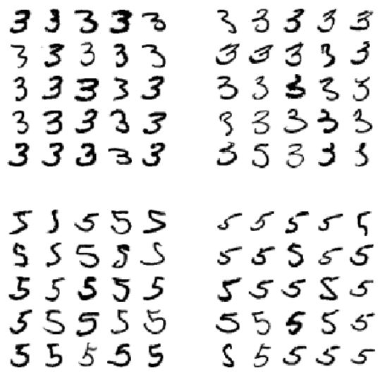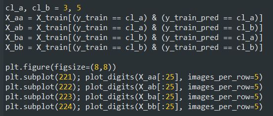 بررسی خطای هر نمونه هم راه خوبی هست چون میتونیم بفهمیم که چرا مدل یک نمونه رو نمیتونه درست تشخیص بده. البته این راه سخت تر هست و زمان بیشتری هم میبره. بیاید برای مثال دسته 3 و 5 رو رسم کنیم. کتاب برای رسم این دسته ها خودش یک تابع نوشته و توضیح خاصی نداده. میتونید این قسمت از کد رو کپی کنید: