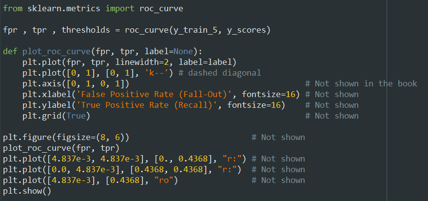 از اونجایی که منحنی ROC شبیه به منحنی Precision/Recall هست، ممکنه براتون سوال پیش بیاد که از کدومشون باید استفاده کنیم. بر اساس قاعده سرانگشتی، اگر دسته مثبت تعداد کمی دارن یا وقتی مثبت های غلط اهمیت بیشتری برای ما دارن، استفاده از منحنی PR ارجحیت داره. در غیر این صورت از ROC استفاده میکنیم. برای مثال، توی مثال ROC قبل، ممکنه فکر کنید که عملکرد مدل عالیه. اما این به این خاطر هست که تعداد دسته مثبت یعنی 5 ها در برابر دسته منفی یعنی غیر 5 ها، خیلی کمه. در مقابل منحنی PR نشون میده که مدل هنوز جا برای بهتر شدن داره چون هنوز به اندازه کافی به گوشه بالا سمت چپ نزدیک نشده