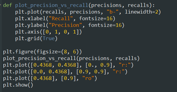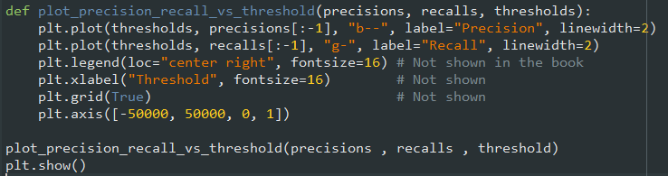 یک راه دیگه برای انتخاب مقدار مناسب Precision/Recall اینه که این دو تا رو در برابر هم دیگه رسم کنیم. کد زیر این نمودار رو رسم میکنه:
