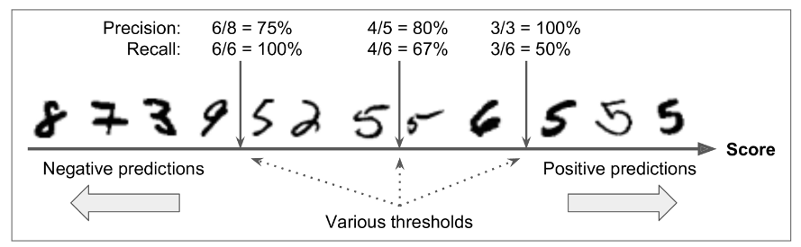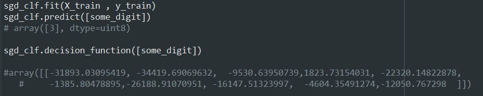 ترین کردن یک SGDClassifier یا (RandomForestClassifier) به همین سادگیه. البته دقت کنید که مدل ما نتونست به خوبی 5 رو تشخیص بده و به جاش 3 حدس زده. وقتی تابع decision_function رو فراخوانی میکنیم تا امتیاز هر دسته رو ببینیم، میبینیم که مدل با اعتماد به نفس بالایی داره اشتباه حدس میزنه!