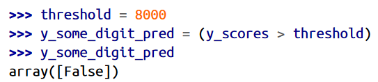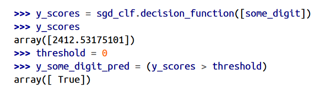 نتیجه کد بالا با تابع predict یکسان هست چون آستانه SGDClassifier برابر صفر هست. حالا آستانه رو افزایش میدیم:
