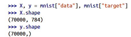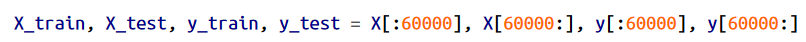 خب همینجا باید صبر کنید. همیشه باید یک تست ست بسازیم و اونو بذاریم کنار و هیچ کاری هم باهاش نداشته باشیم. دیتاست MNIST خودش به ترینینگ ست (60000 نمونه اول) و تست ست(10000 نمونه بعدی) تقسیم شده و فقط کافیه کد زیر رو اجرا کنیم: