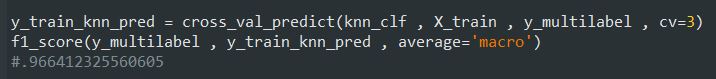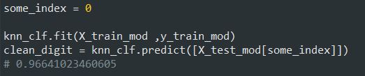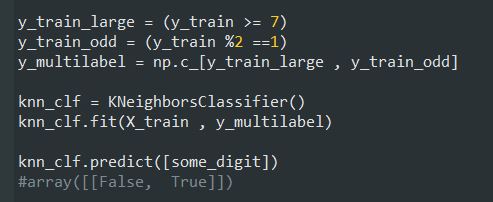 این کد یک آرایه به نام y_multilabel شامل دو لیبل برای هر عکس درست میکنه. اولین لیبل بررسی میکنه که آیا عدد بزرگ هست یا نه (7 و 8 و 9 ) و دومی بررسی میکنه که آیا فرد هست یا نه. خط بعدی یک شیء از کلاس KNeighborsClassifier درست میکنه و بعد اون رو با آرایه ای که گفتیم ترین میکنیم. بعد ازش میخوایم تا عددی که بهش میدیم رو حدس بزنه: