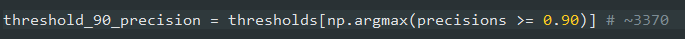 فرض کنید میخوایم به Precision 90% برسیم. یک نگاه به نمودار اول میکنیم و میبینیم که برای این کار، آستانه باید حدود 3400 باشه. اگر بخواید دقیق تر باشید، میتونید کمترین مقدار آستانه رو که به ما حداقل Precision 90% میده با استفاده از دستور زیر بدست بیارید: