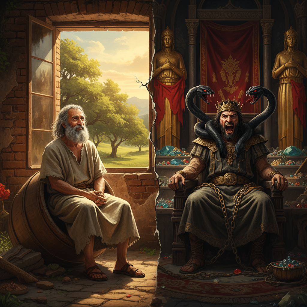 ما در داستانها همانطور که دیوژن را داریم، ضحاک را نیز میبینیم. اولی که از کل مادیات خالی است و در خرابهای زندگی میکند، اما رضایتمند است؛ و دومی که در قدرت و ثروت میزیَد و همواره از دست دادن قدرت و نارضایتی در او میجوشد. صحبت من زندگی درویشانه و بیحرکت بودن نیست، بلکه میگویم آدمی باید حقیقت را بداند: هیچ چیز جلوتر انتظارش را نمیکشد. به هر چیز که دست یابد، شیرینی آن اول به کامش خوش میآید و پس از مدتی تبدیل به تلخی میشود و او را زده میکند. آدمی وقتی این حقیقت را بداند، آرامتر و آسودهتر قدم برمیدارد و زندگیاش را راستینتر میسازد.