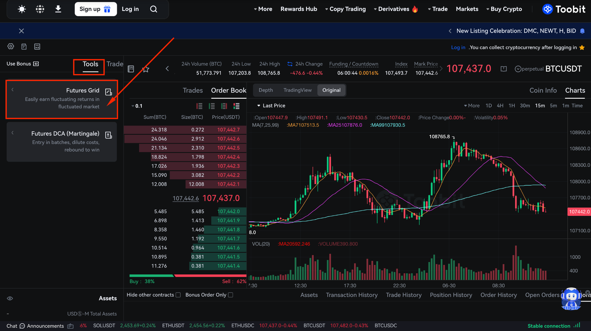 ● Toobit: این صرافی ابزارهای پیشرفتهای مانند Grid Bot برای معاملات خودکار، Copy-Trading برای کپی استراتژیهای معاملهگران حرفهای، و ادغام با TradingView برای تحلیل تکنیکال ارائه میدهد. حساب دمو به کاربران مبتدی اجازه میدهد بدون ریسک تمرین کنند، و Lite Perpetual برای سادهسازی معاملات فیوچرز طراحی شده است.