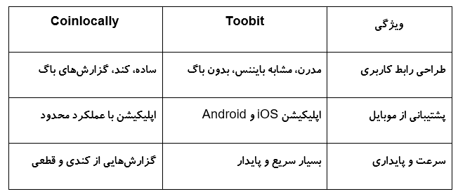 متا دیسکریپشن: صرافی Toobit یا Coinlocally؟ در این مقاله جامع، دلایل برتری Toobit از نظر امنیت، ابزارهای معاملاتی، پشتیبانی و مناسب بودن برای کاربران ایرانی بررسی شده است.