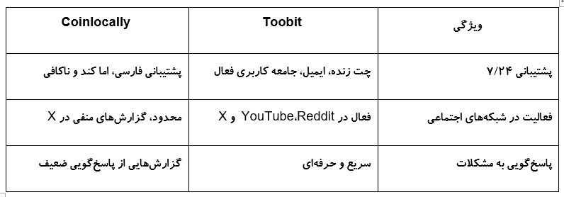 ● Coinlocally: اگرچه پشتیبانی فارسی ارائه میدهد، گزارشهای متعددی از پاسخگویی کند، عدم حل مشکلات و حتی مسدود شدن حسابها بدون اطلاع قبلی وجود دارد.