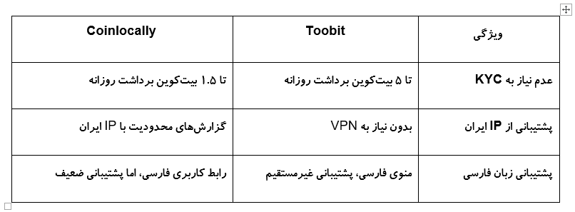 ● Coinlocally: اگرچه رابط کاربری فارسی دارد، گزارشهایی از مسدود شدن حسابهای کاربران ایرانی یا مشکلات برداشت وجود دارد که اعتماد به این پلتفرم را کاهش میدهد.