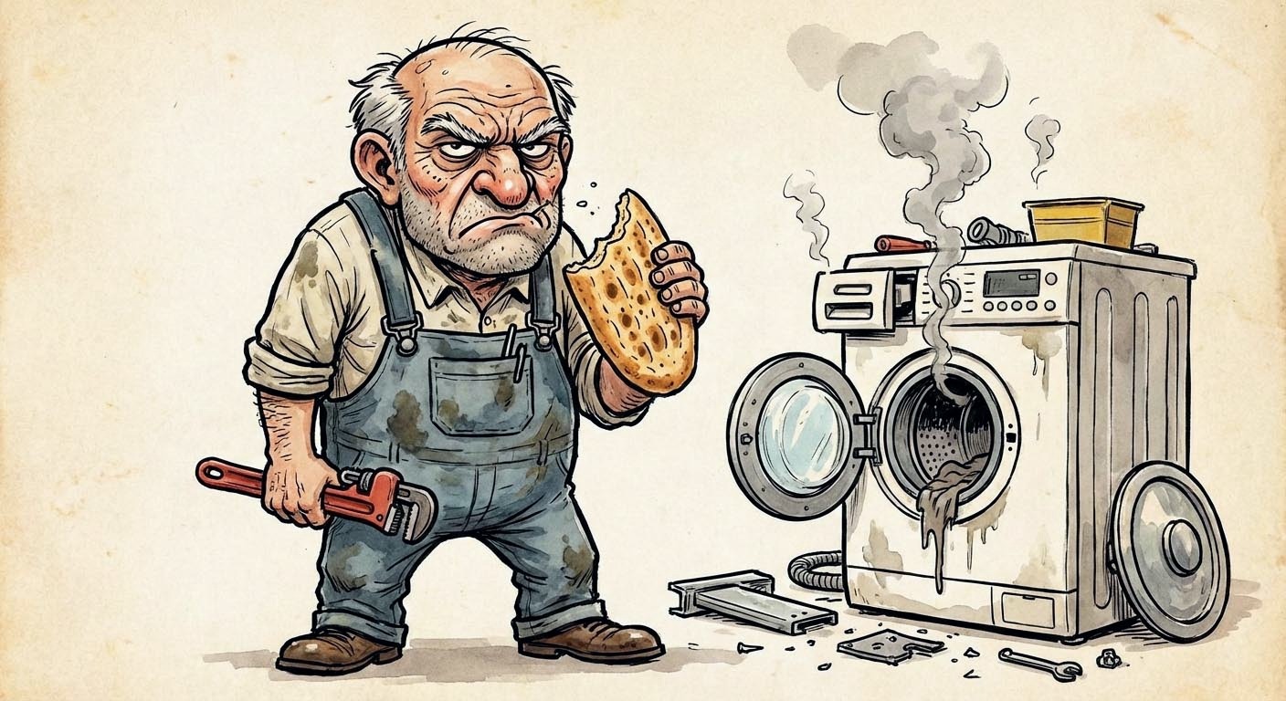 ناامید شدم و زنگ زدم دومی. طرف گفت "سریع میام". و واقعاً اومد، ولی ای کاش نمیومد! یک آقای میانسال با شلوار راحتی و دمپایی لاانگشتی وارد شد. یک جعبه ابزار داشت که توش فقط یک پیچگوشتی زنگزده و یک نون بربری نصفه بود که کنجداش داشت میریخت روی فرش عزیزتر از جانم. در ماشین لباسشویی رو باز کرد، یه ربع زل زد به داخلش، بعد یه لگد آروم زد به لاستیک دور در، یه نگاه عاقلاندرسفیه به من انداخت و گفت: "کی بهت گفته از مایع لباسشویی استفاده کنی؟ این دستگاه حساسه! فقط باید با پودر دستی که زیر نور ماه کامل توسط راهبهای تبت ساخته شده کار کنه!" آخرشم ۵۰۰ هزار تومن هزینه ایاب و ذهاب گرفت (برای مسیری که پیاده ۵ دقیقه بود) و گفت برد الکترونیکیش سوخته و تو ایران نیست، باید بری اوراقیهای شوش رو بگردی.