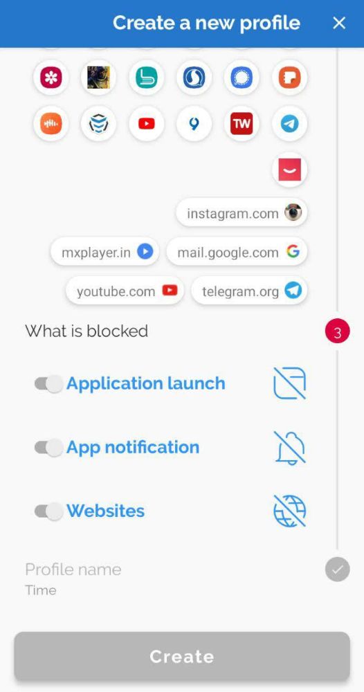 بعد از اینکه اپ ها و سایت های مورد نظر خودتون رو انتخاب کردید، در سومین مرحله باید انتخاب کنید دقیقا چه چیز هایی از اون اپ ها رو می خواید بلاک کنید. گزینه اول برای اینکه اپ باز نشه براتون، گزینه دوم برای انسداد نوتیفیکیشن هاست و گزینه سوم هم که سایت ها. هر سه تارو فعال کنید.