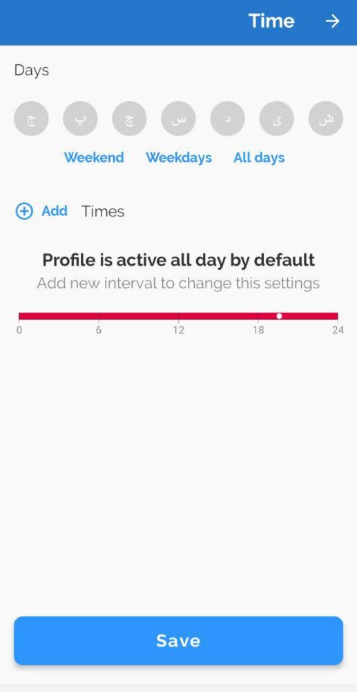 در قسمت بالا می تونید انخاب کنید چه روز هایی از هفته محدودیت اعمال بشه و پایینش اونجا که نوشته times می تونید بازه زمانی اون در هر روز رو مشخص کنید. بزنید روی Add تا بتونید بازه زمانی رو انتخاب کنید مثلا از هفت صبح تا دوازده که کلاس آنلاین دارید ولی حواستون تو اینستا یا ویرگوله می تونید این دو تا شبکه اجتماعی رو بلاک کنید تو اون بازه تا نتونید بهشون دسترسی داشته باشید. پس از انتخاب روز ها و ساعات مورد نظر Save رو بزنید.