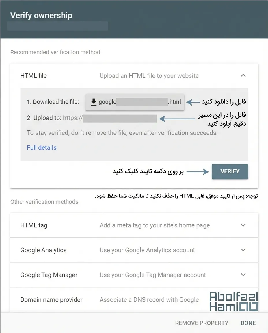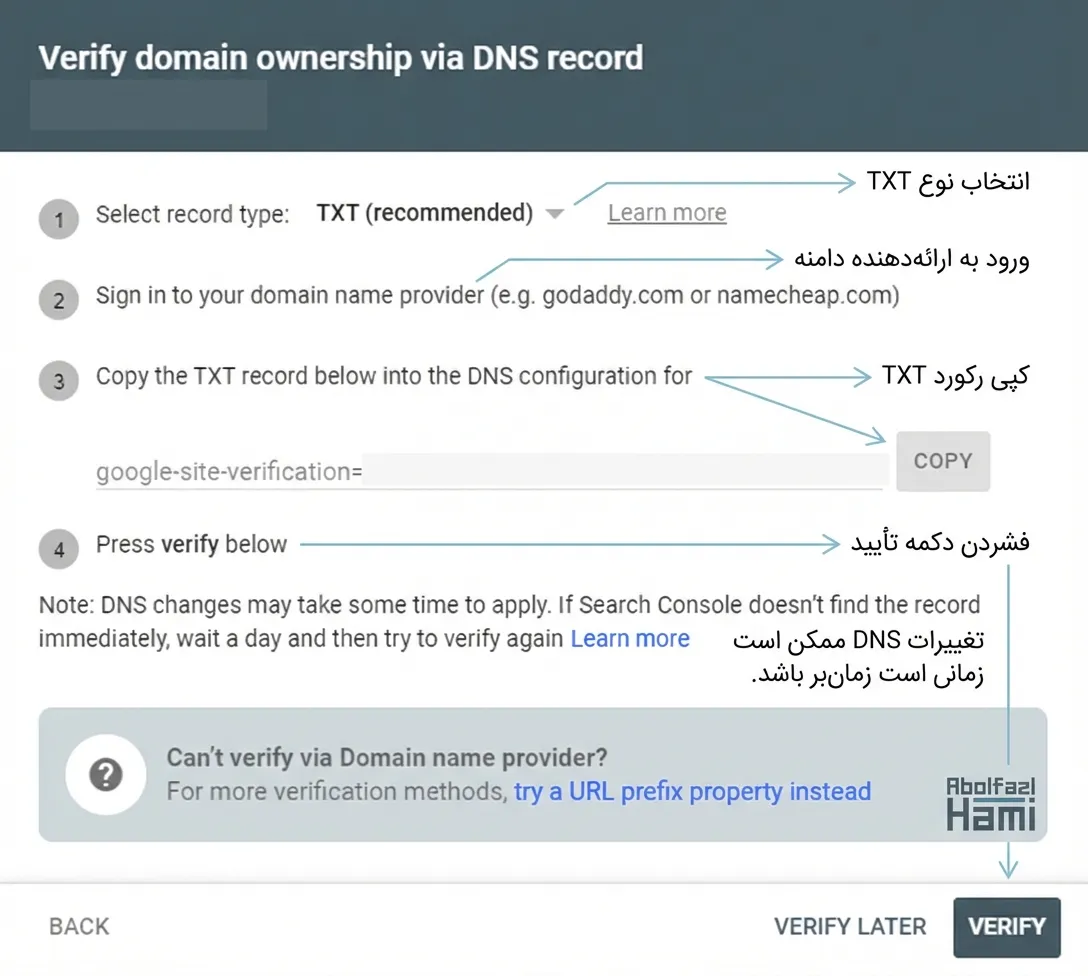 پیشنهاد خودِ گوگل و ما، استفاده از روش TXT است چون سریعتر و راحتتر است.