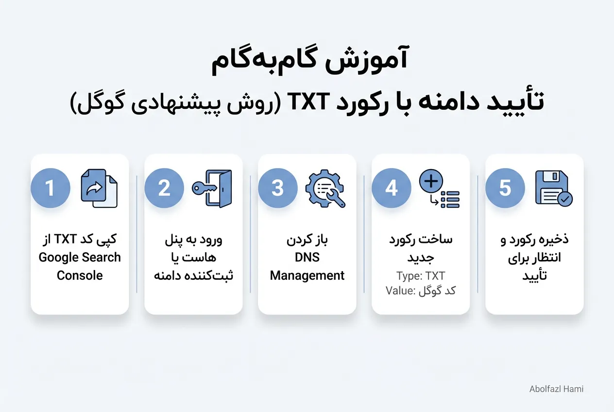 برای استفاده از این روش، گوگل باید مطمئن شود شما صاحب اصلی دامنه هستید. برای اثبات این موضوع، باید تغییری کوچک در تنظیمات DNS (اتاق فرمانِ دامنه شما) ایجاد کنید. نترسید! کار پیچیدهای نیست.