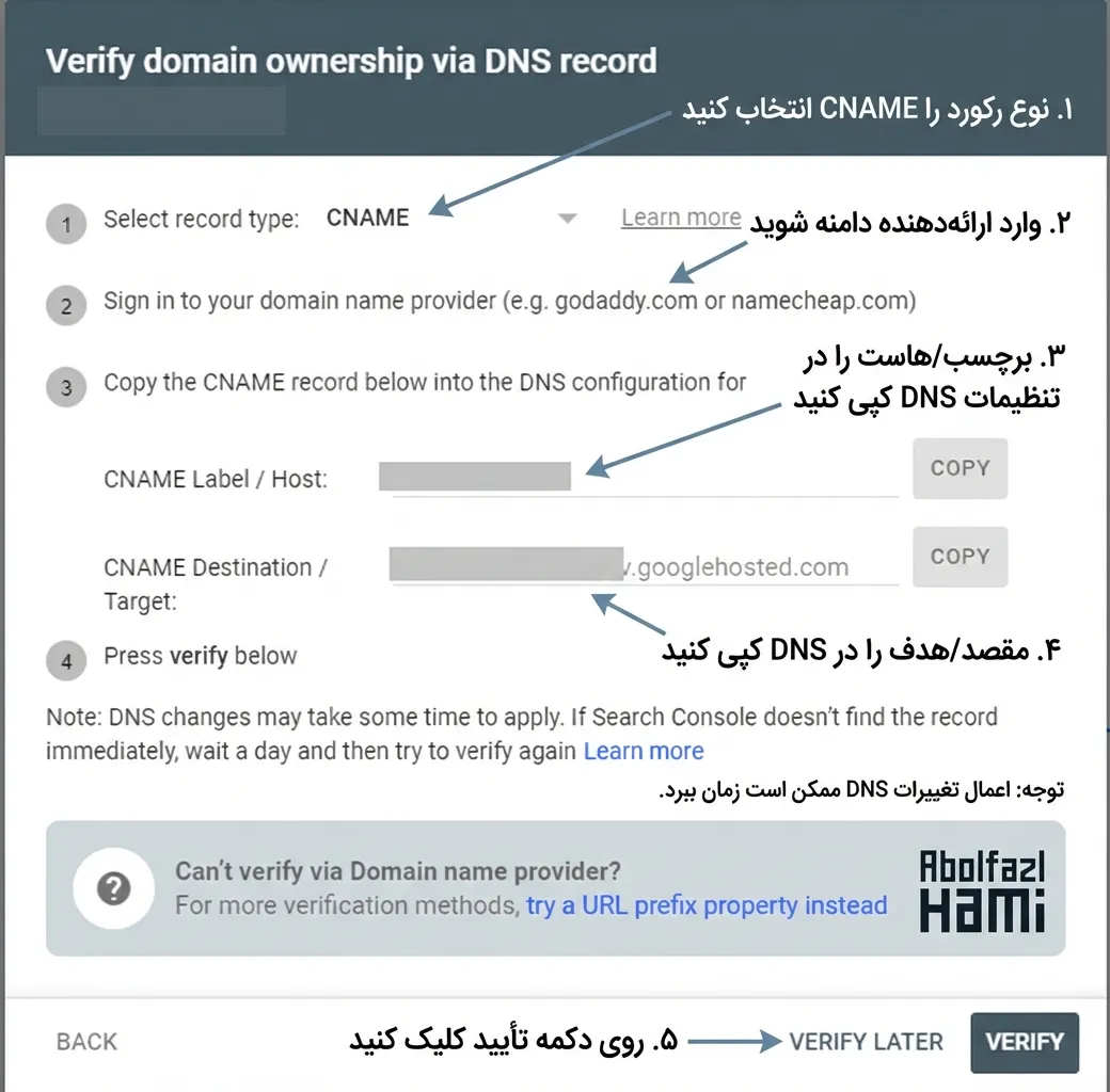 گاهی اوقات ممکن است با روش TXT راحت نباشید یا هاست شما کمی اذیت کند. هیچ اشکالی ندارد! گوگل یک راه پشتیبان هم گذاشته است به نام CNAME.