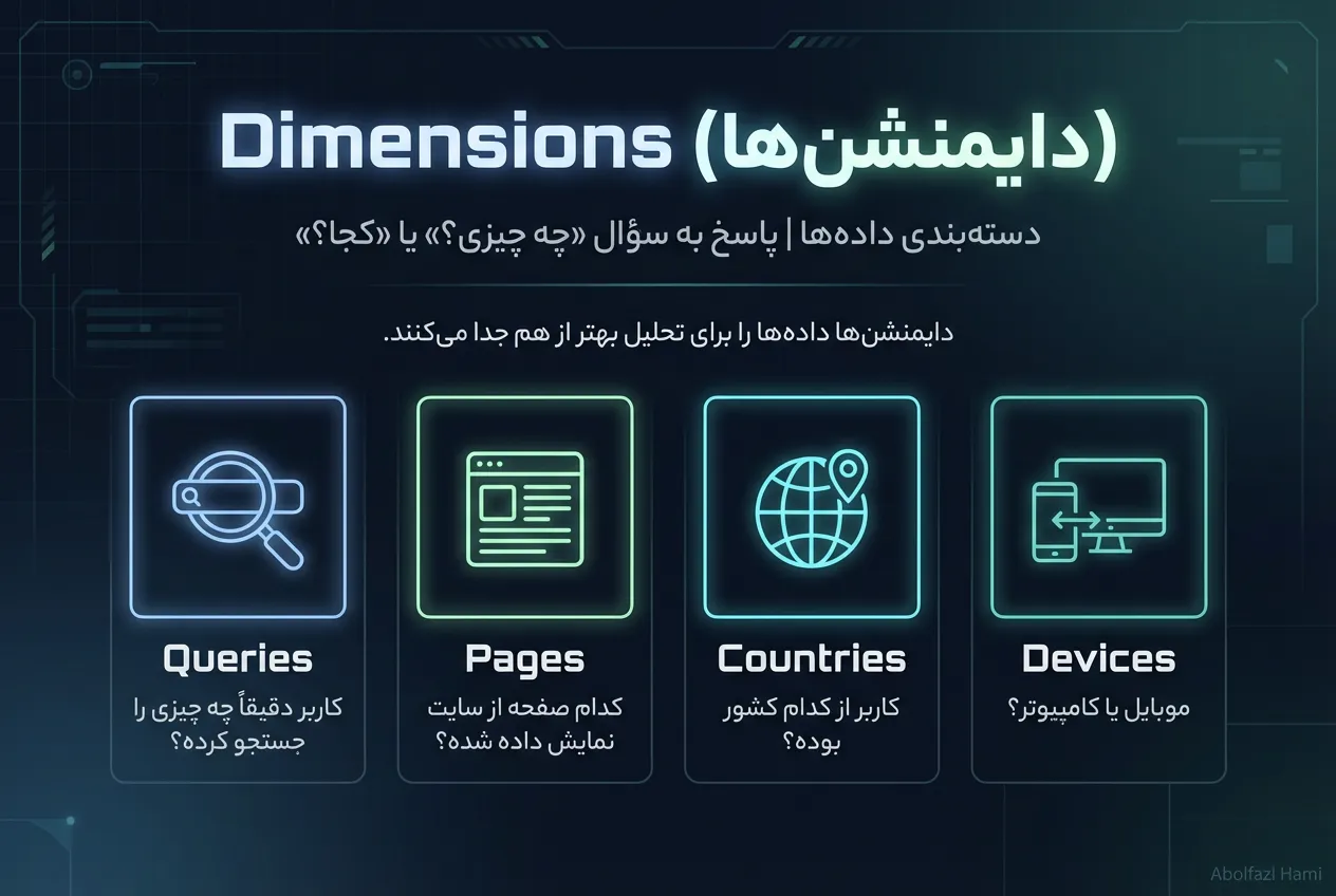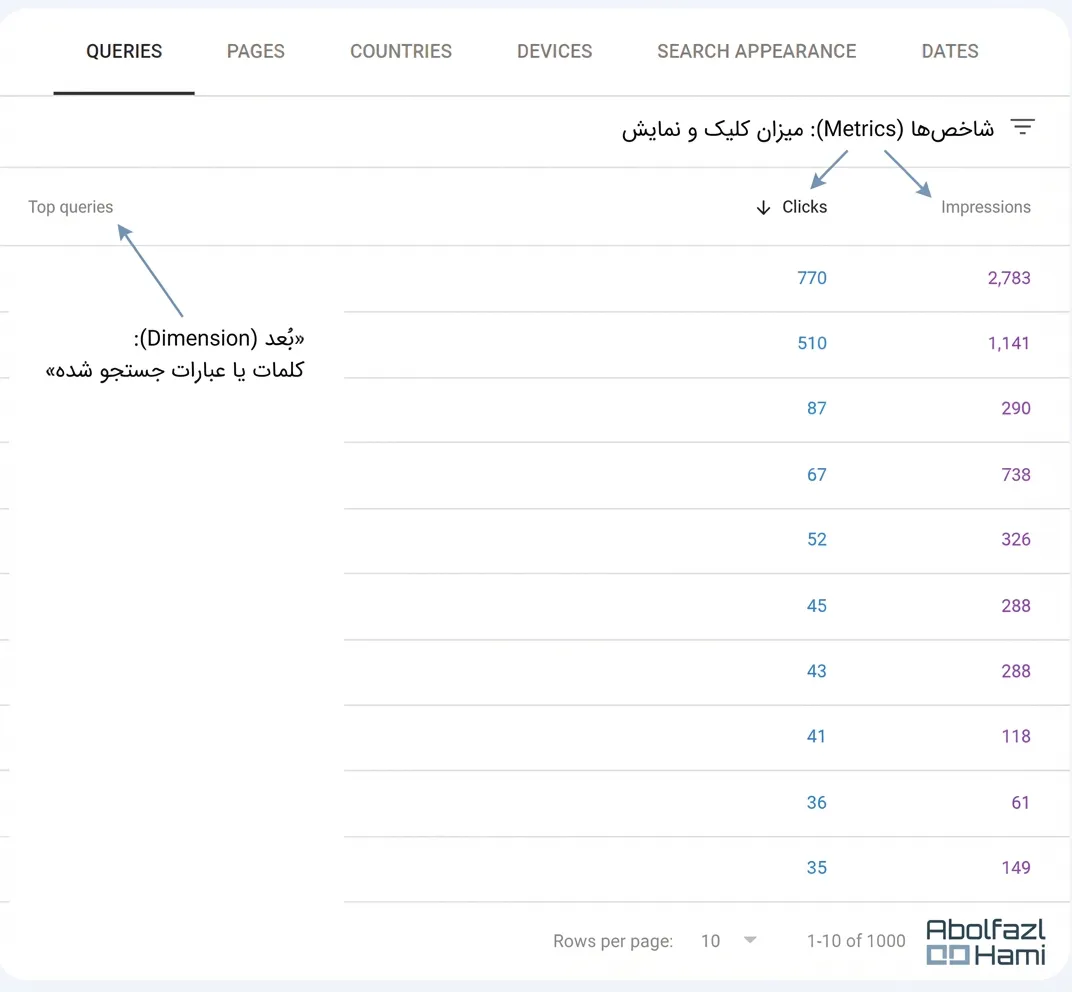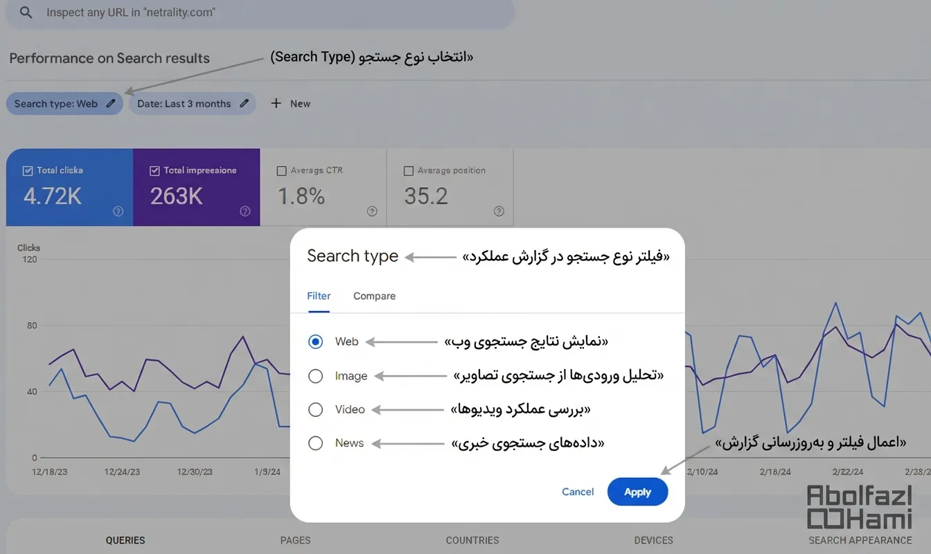 اگر سایت شما “فروشگاه لباس” (تصویر محور) یا “سایت آموزشی” (ویدیو محور) است، حتماً روی دکمهای که در بالای نمودار نوشته شده Search Type: Web کلیک کنید و آن را به Image یا Video تغییر دهید. شاید تعجب کنید که چقدر ترافیک از این بخشها دارید و خبر نداشتید!