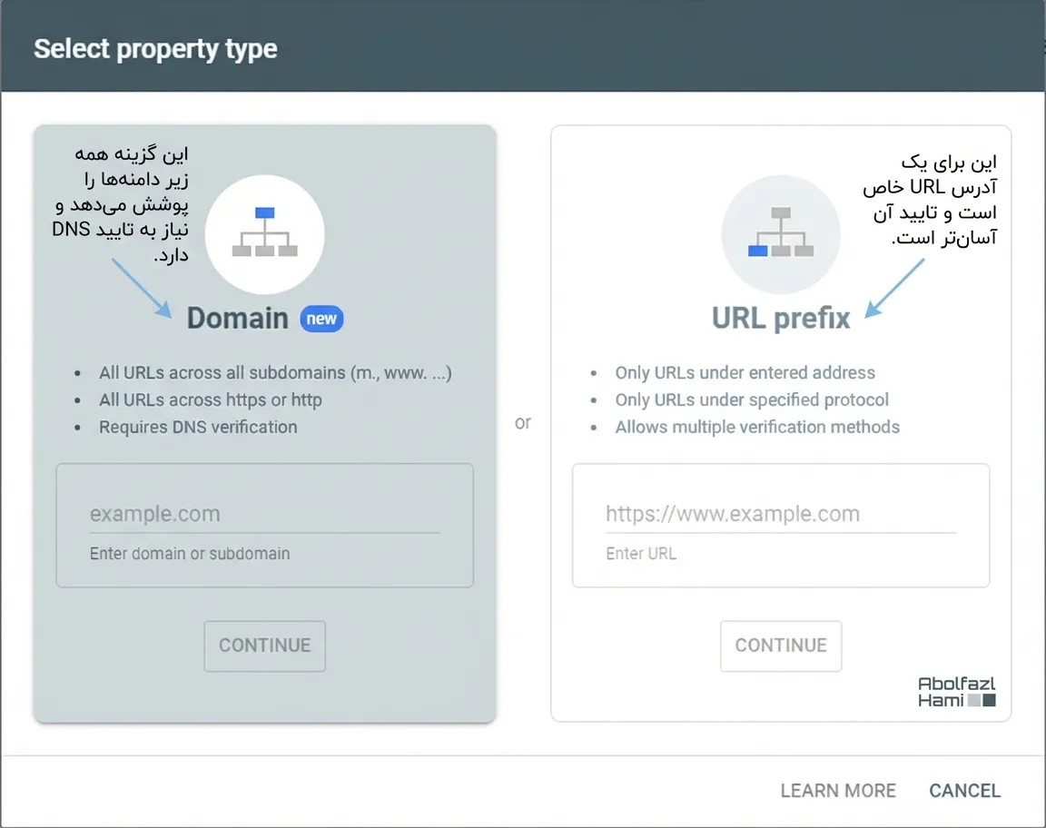 اگر این اولین باری است که میخواهید سایتتان را به گوگل معرفی کنید، پیشنهاد میکنیم حتماً از روش دامنه (Domain) استفاده کنید.