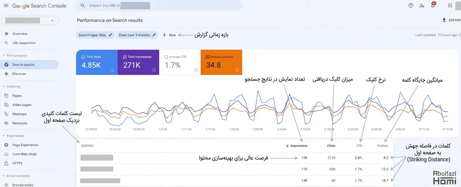 گزارش Performance در بالای منوی سمت چپ، قلب تپنده سرچ کنسول است. این گزارش به شما میگوید کاربران دقیقاً با چه کلماتی و از چه طریقی وارد سایت شما شدهاند.