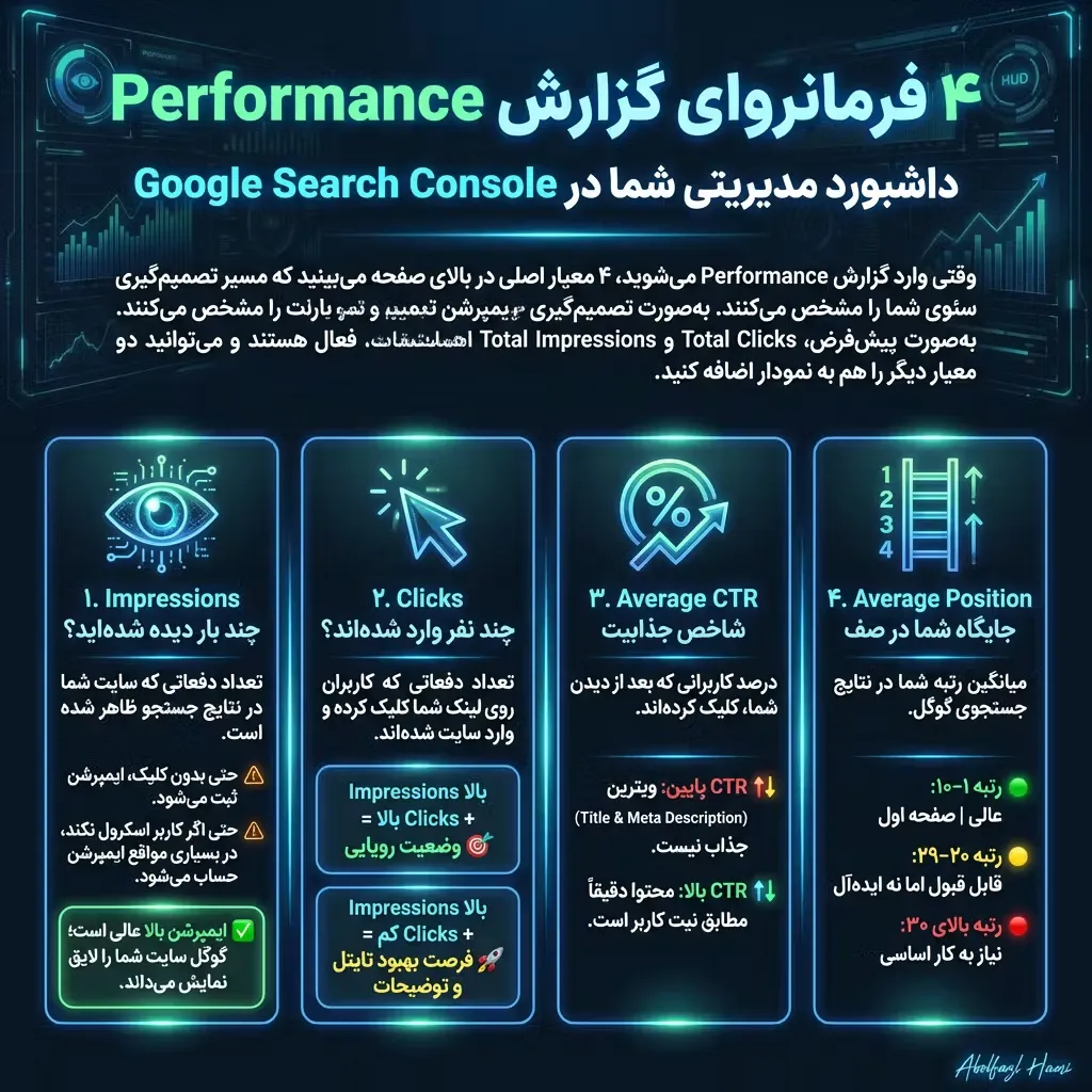 وقتی وارد گزارش عملکرد (Performance) میشوید، ۴ معیار اصلی در بالای صفحه میبینید که حکم داشبورد مدیریتی شما را دارند.
