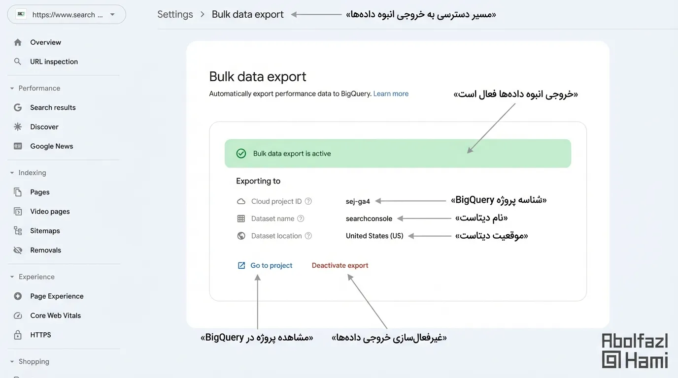 شما میتوانید سرچ کنسول را به سرویس BigQuery گوگل متصل کنید تا دادههای خام سایتتان به صورت خودکار در آنجا ذخیره شود. در BigQuery هیچ محدودیت زمانی وجود ندارد و میتوانید اطلاعات را برای همیشه نگه دارید.