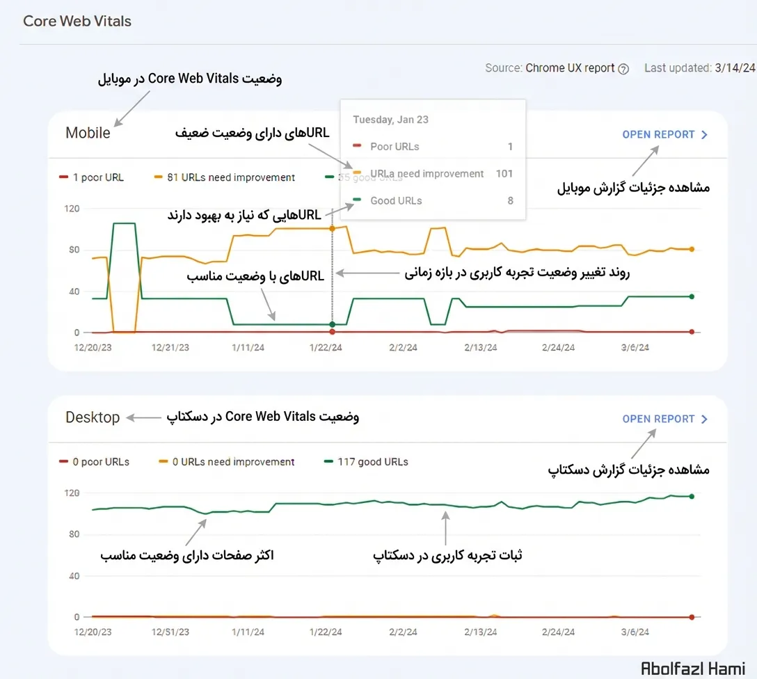 مزیت: بررسی دقیقتر مشکلات خزش (Crawlability)، دسترسیپذیری (Accessibility) و تجربه کاربری، مستقیماً با استفاده از دادههای واقعی گوگل.