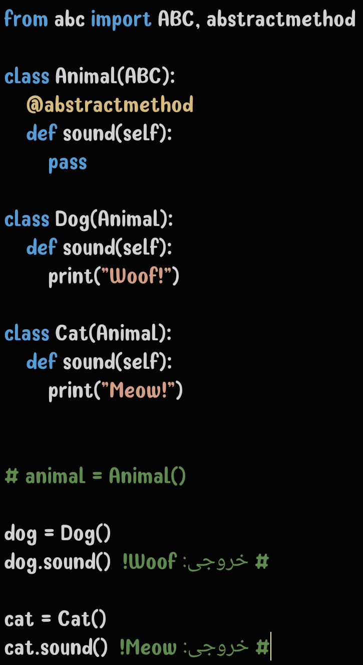 در این مثال، کلاس Animal یک کلاس abstract است و یک روش abstract به نام sound دارد. هر کلاسی که از Animal ارثبری میکند، باید این روش را پیادهسازی کند. در مثال بالا، کلاسهای Dog و Cat از Animal ارثبری کردهاند و روش sound را پیادهسازی کردهاند.