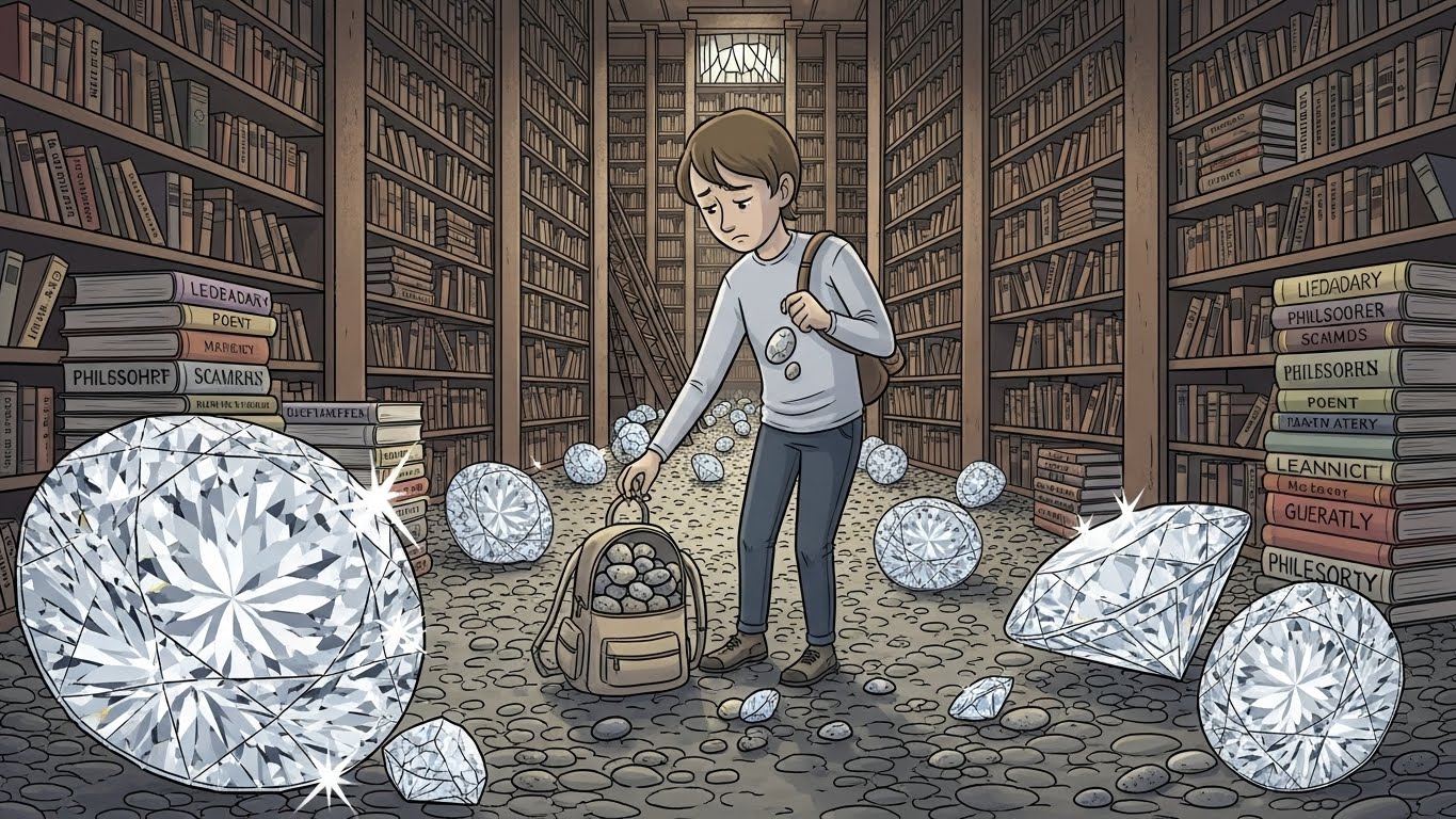 امروز من مصداق بارز کسی بودم که یه کولهپشتی داره (ذهن)، توی معدن الماس وایساده و داره از روی زمین سنگریزه جمع میکنه میریزه تو کولهش.