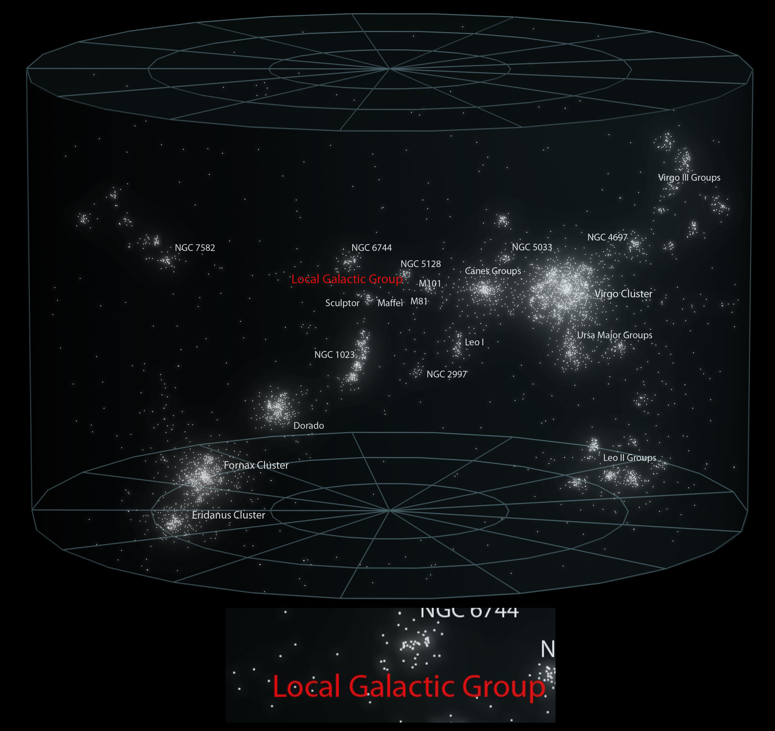 خوشه کهکشانی یا خوشه محلی، همان منطقه کوچکی است که در تصویر بالا مشخص شده. به یک نکته توجه داشته باشید: آن نقطهها، ستاره یا سیاره یا حتی منظومه نیستند. هر کدام از آن نقطهها یک کهکشان هستند. یک کهکشان! هر کدام حاوی میلیاردها میلیارد ستاره و سیاره و منظومه و...