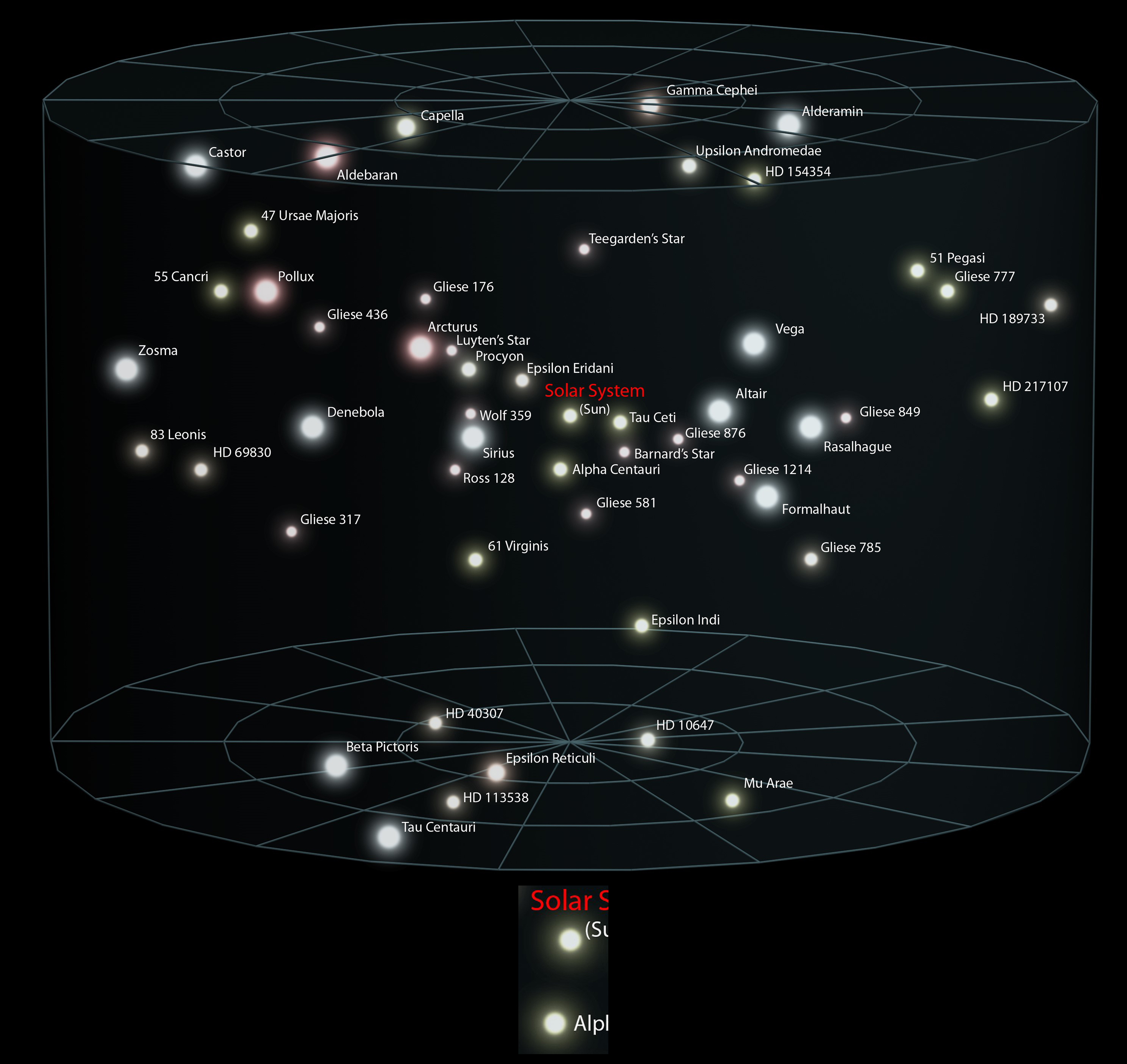 اگر از روی این ستارهها کسی هماکنون در حال نگاه کردن با تلسکوپ به زمین باشد، آیا «ما» را میبیند؟ پاسخ منفیست. اگر از ظهرالاسد نگاه کند، بهروز وثوقی را میبیند که در حال بازی در فیلم قیصر است. اگر از HD 189733 نگاه کند، محمد علی کلی را میبیند که در المپیک رم دارد بوکس میکند. اگر از تاو قنطورس نگاه کند، ناصرالدین شاه قاجار را میبیند که در یکی از باغهای قصر خود قدم میزند و اگر از گاما قیفاووس در حال نگاه کردن باشد، ارتش اشکانیان را میبیند که در نبرد با رومیان هستند.