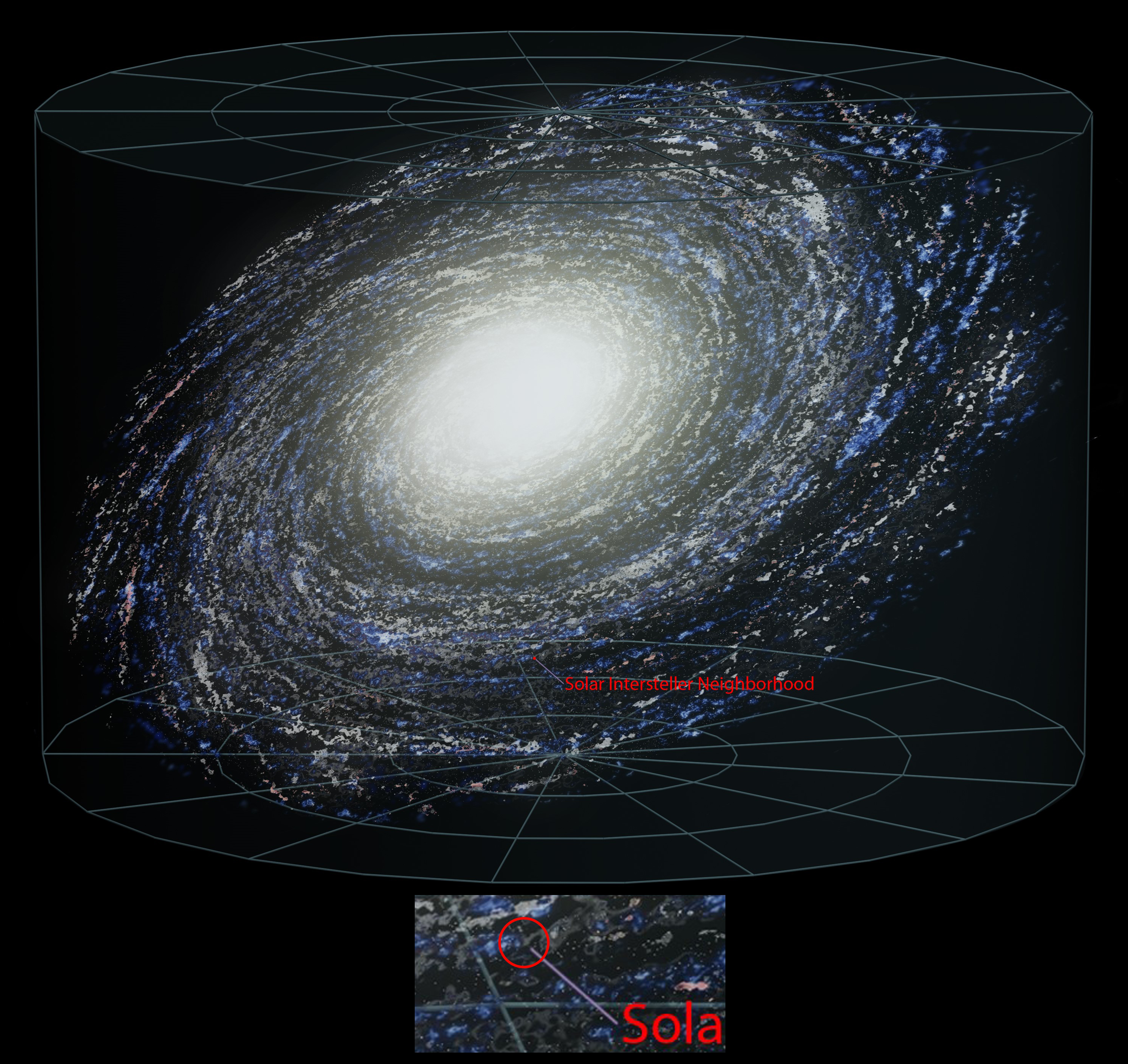 محله میانستارهای خورشیدی، که در بخش قبل فهمیدیم چقدر در این محله کوچک، سرگردان و ناچیز هستیم، آن نقطه قرمز در بازوی کهکشانی است که برای دیدنش باید زوم کنیم. اگر محله میانستارهای که ما در آن، انقدر کوچک بودیم، خود فقط یک نقطه ناچیز در کهکشان راه شیری باشد، پس ما چقدر در این کهکشان ناچیزیم؟