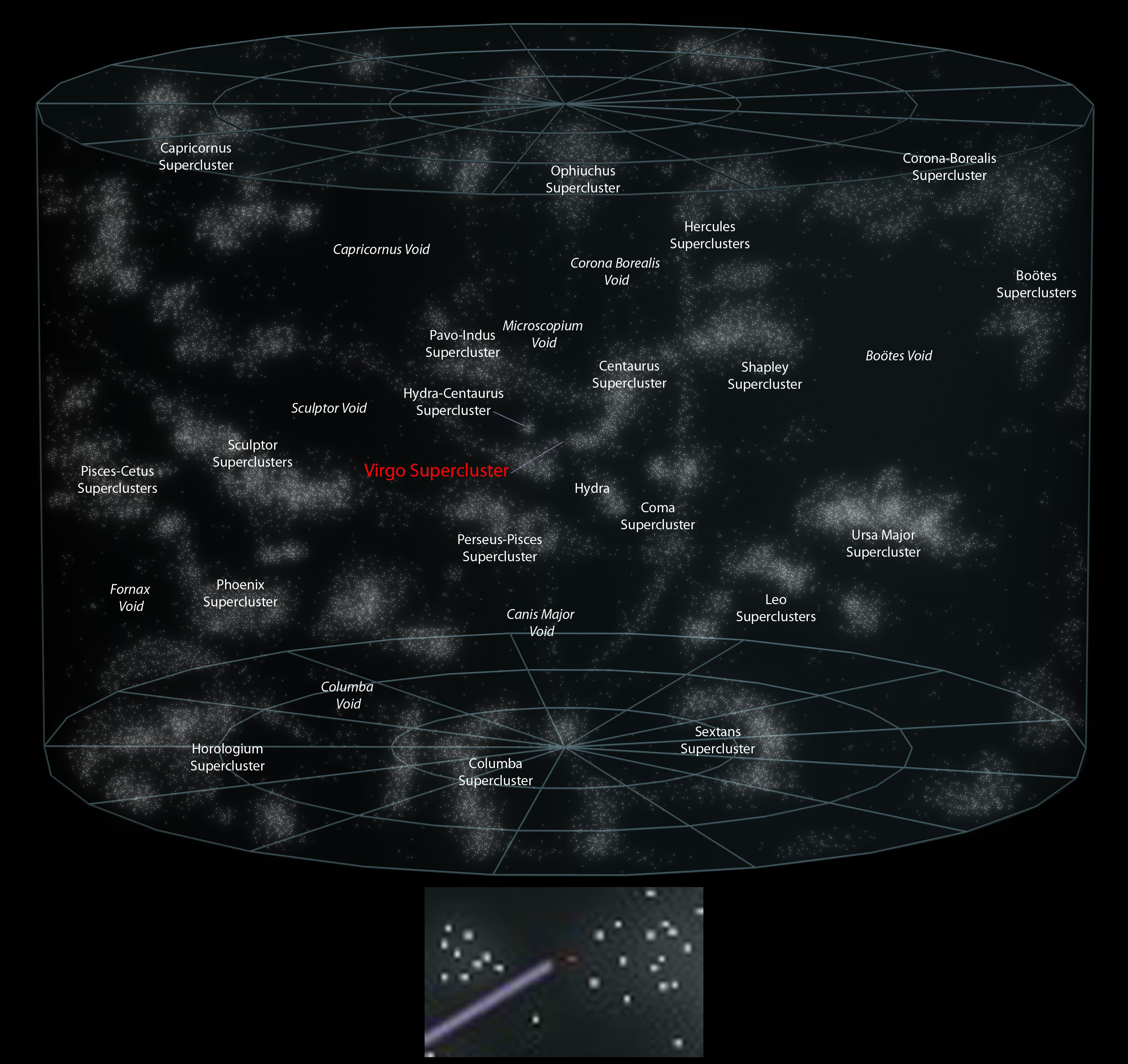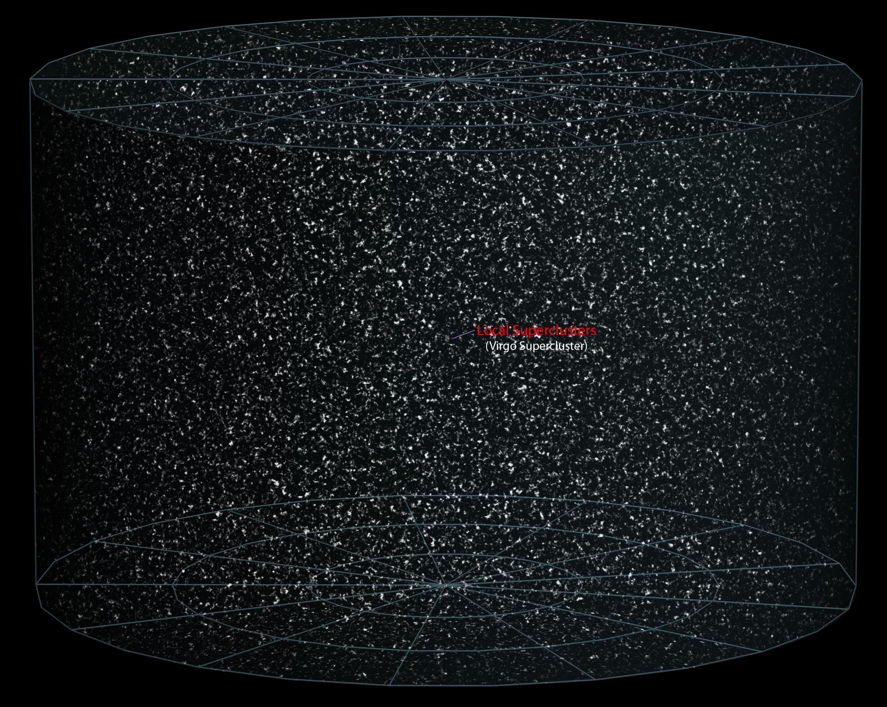 در عکس بالا، هر نقطه، یک ابرخوشه مانند لانیآکیا است. یعنی هر کدام از نقطههای بالا، ۱۰۰,۰۰۰ کهکشان در خود دارند و هر کهکشان، میلیاردها میلیارد ستاره و سیاره و قمر و منظومه و محله میان ستارهای در خود دارد.