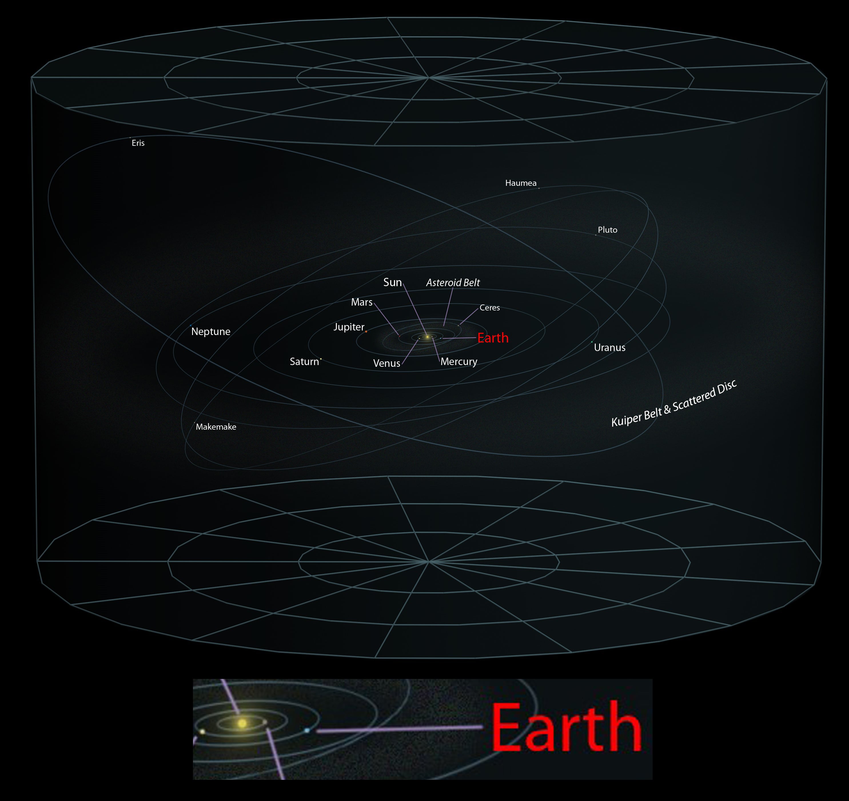 فاصله مرکز منظومه یعنی خورشید تا مدار نپتون که دورترین سیاره از خورشید است، نزدیک به ۴٫۵ میلیارد کیلومتر یا ۳۰ واحد نجومی است (هر واحد نجومی برابر است با ۱۵۰ میلیون کیلومتر). پس از آن، کمربند کویپر را داریم که حدود ۳۰ تا ۵۰ واحد نجومی (۴٫۵ تا ۷٫۵ میلیارد کیلومتر) از خورشید دور است.