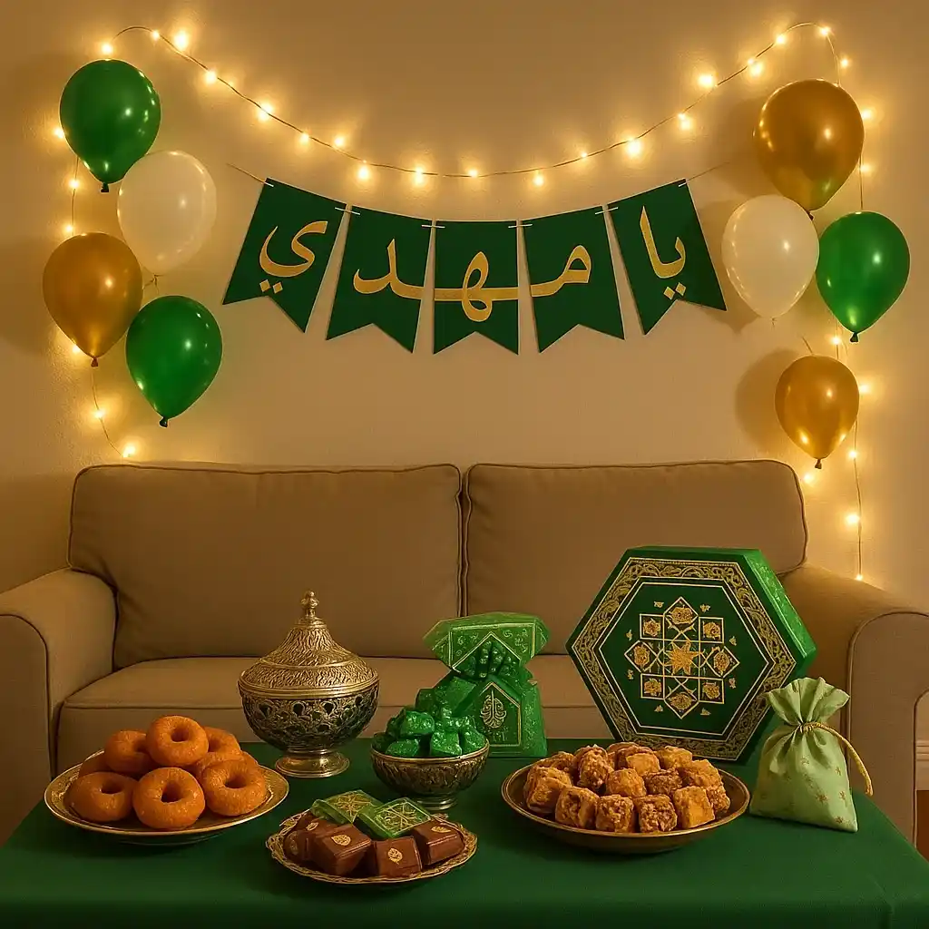 آویزهای سنتی، پرچمهای کوچک «یا مهدی»، و پارچهنوشتههای عربی مثل «عيد النصف من شعبان مبارك» میتوانند نقطه کانونی دکور شما باشند.