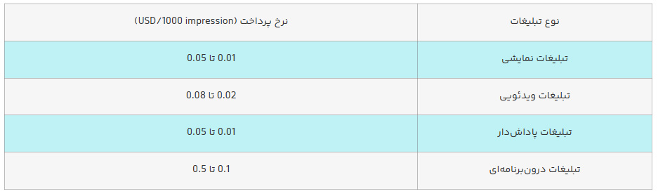 نرخهای پرداخت در AdMob میتواند بسته به عوامل مختلفی مانند نوع تبلیغ، موقعیت جغرافیایی کاربران، نرخ پر شدن تبلیغات (fill rate) و تقاضای تبلیغکنندگان، بسیار متغیر باشد. با این حال، میتوانیم یک مظنه تقریبی برای انواع مختلف تبلیغات ارائه دهیم: