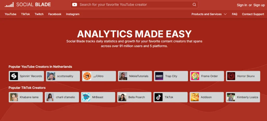سوشالبلید(SocialBlade) یک پلتفرم محبوب برای مشاهده آمارهای عمومی کانالهای یوتیوب است. این ابزار به شما امکان میدهد تا تخمین درآمد، رشد سابسکرایبرها و بازدیدها را مشاهده کرده و عملکرد کانال خود را با دیگران مقایسه کنید.