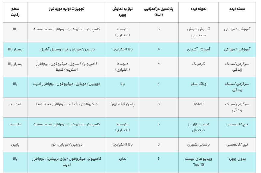 برای کمک به انتخاب بهتر بین انواع کانال یوتیوب، در جدول زیر به مقایسه برخی از ایدههای برتر با توجه به پتانسیل درآمدزایی، نیاز به نمایش چهره و تجهیزات اولیه پرداختهایم. این جدول میتواند به شما دیدگاهی کلی برای شروع یوتیوب و انتخاب بهترین موضوع برای شروع یوتیوب ارائه دهد.
