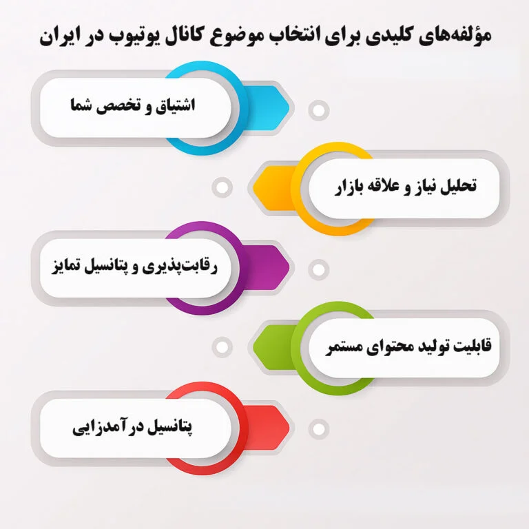 انتخاب موضوع مناسب برای کانال یوتیوب، اولین و مهمترین گام در مسیر موفقیت است. این انتخاب باید بر اساس چند فاکتور اساسی صورت گیرد تا پایداری و رشد کانال شما تضمین شود. در بازار پویای ایران، توجه به این مؤلفهها اهمیت دوچندانی پیدا میکند.