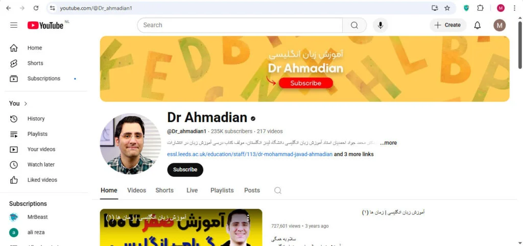 کانال یوتیوب دکتر احمدیان (که با نام Dr. Vlogtor نیز شناخته میشود) یکی از برجسته ترین کانالهای فارسی زبان برای آموزش زبان انگلیسی است که با بیش از 77 هزار مشترک، جایگاه ویژهای در میان زبان آموزان ایرانی دارد.