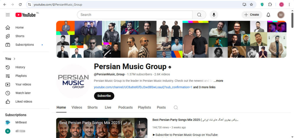 کانال یوتیوب پرشین موزیک گروپ با نزدیک به 987 هزار مشترک، یکی از برجستهترین کانالهای فارسیزبان در حوزه موسیقی ایرانی است. این کانال با تمرکز بر انتشار ویدیوکلیپهای جدیدترین آهنگهای خوانندگان ایرانی، مصاحبهها و اجراهای زنده کنسرتها، به منبعی جامع برای علاقهمندان به موسیقی پاپ، سنتی و دیگر ژانرهای ایرانی تبدیل شده است. پرشین موزیک گروپ با ارائه پلیلیستهای متنوع و محتوای منظم، توانسته جایگاه ویژهای در میان مخاطبان فارسیزبان، بهویژه در ایران و دیاسپورای ایرانی، به دست آورد.