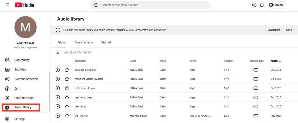اگه حوصله استرسِ «کپیرایت کلیم»، «کپیرایت استرایک» و این داستانها رو نداری، اولین و مطمئنترین جایی که باید سراغش بری Audio Library یوتیوبه؛ همون کتابخانه صوتی رسمی خود یوتیوب. جایی که خود یوتیوب میگه: «هرچی لازم داری همینجاست، با خیال راحت استفاده کن.»